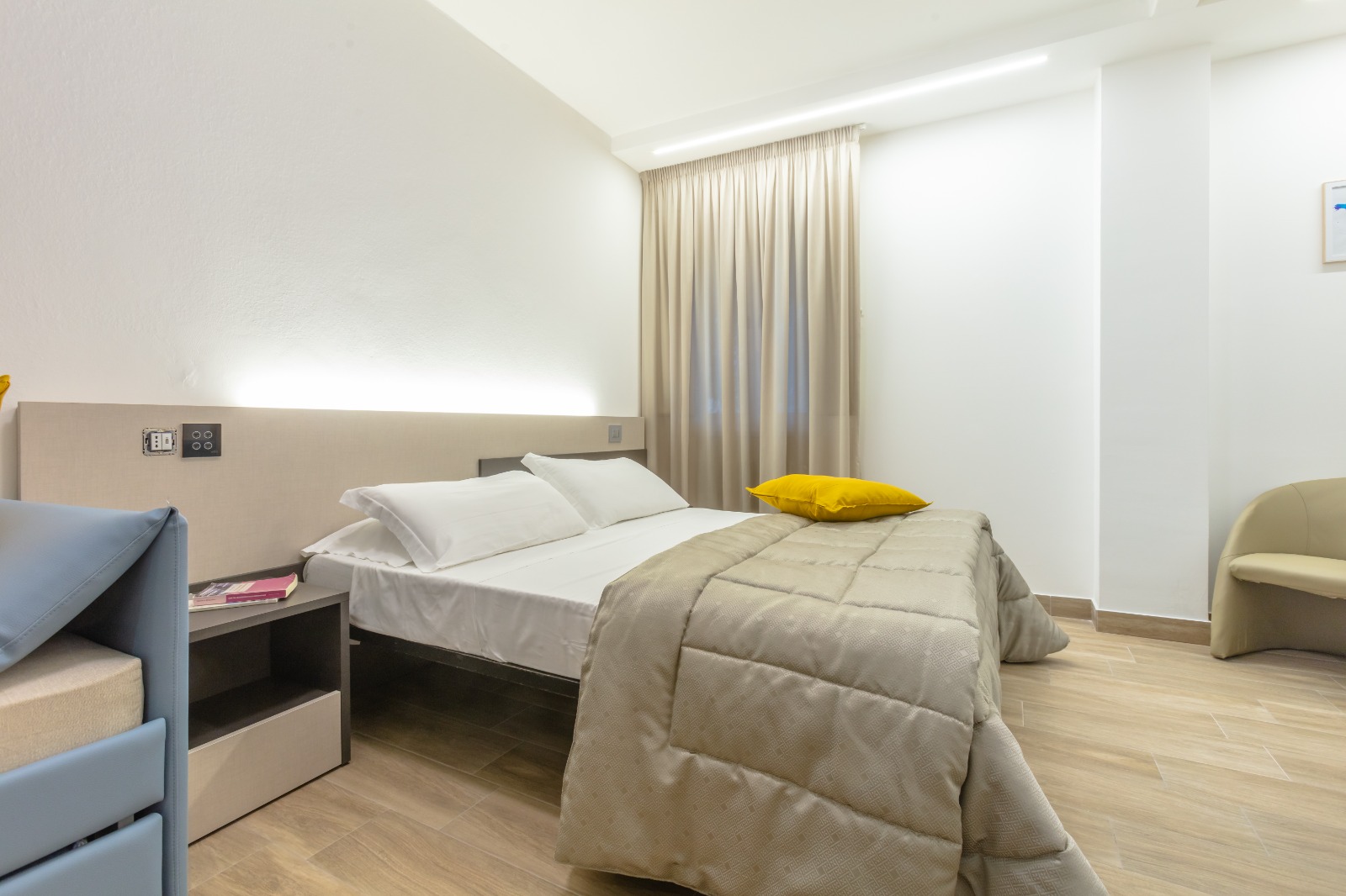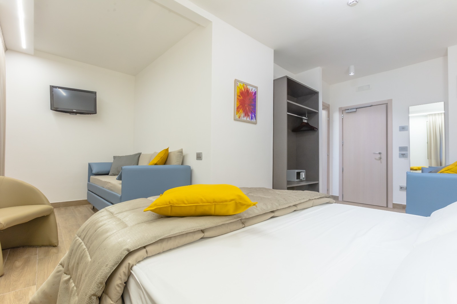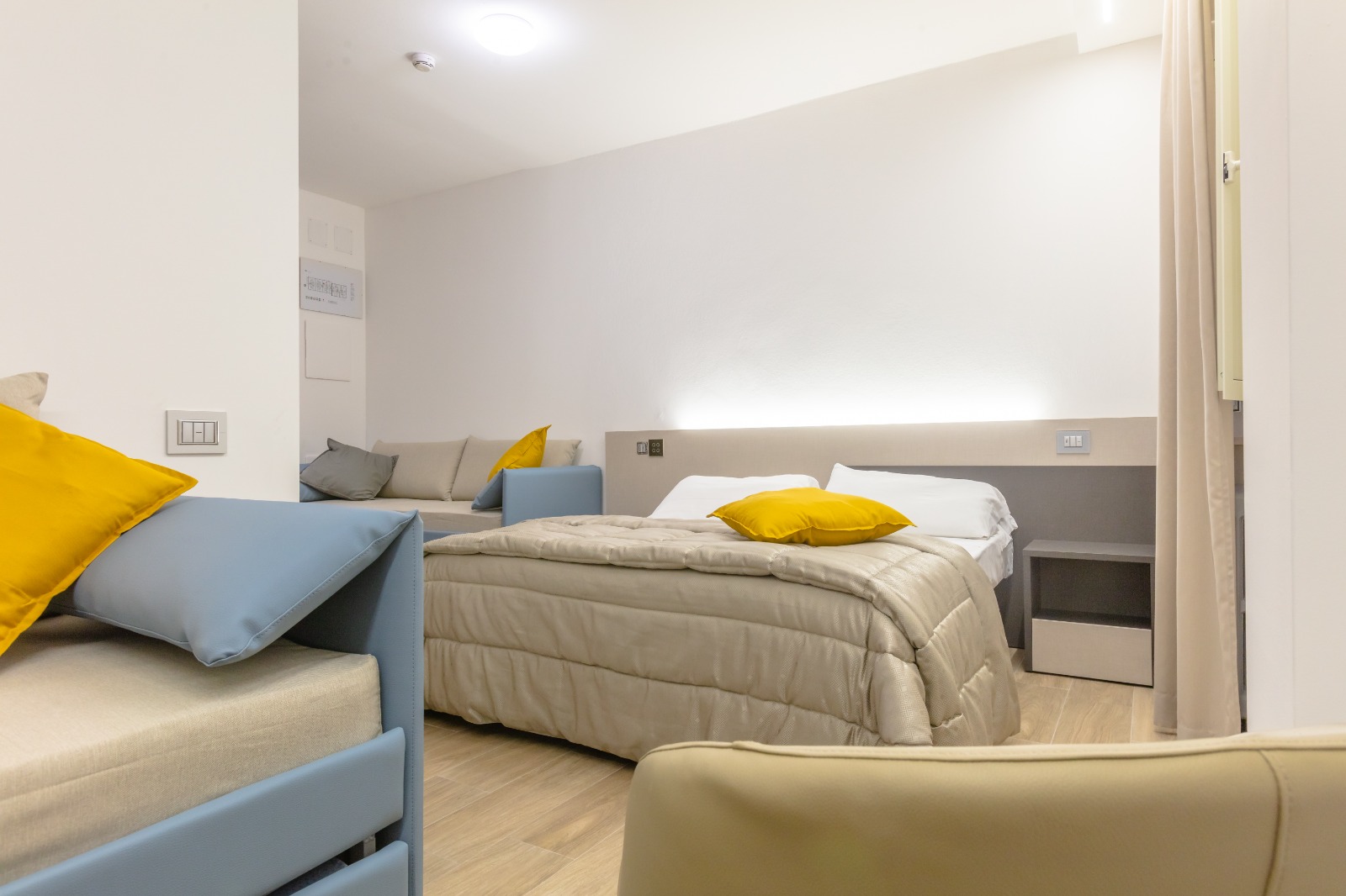 Domotizzata, la camera presenta al suo interno smart TV 50 ‘ con Pacchetto SKY TV inlcuso, WI-FI indipendente, termoregolazione autonoma e mini frigo.